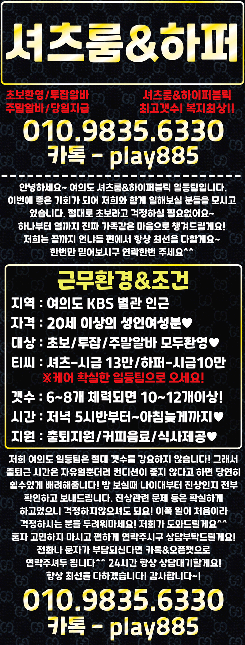 본 정보는 이 게시물에 등록된 업체에서 제공한 자료이며, 꽃길알바는 내용에 대한 오류와 사용자가 이를 신뢰하여 취한 조치에 대해 책임을 지지 않습니다. 또한 누구든 본 정보를 꽃길알바 동의 없이 재배포 할 수 없습니다. Copyright 2021. CMCOMPANY. All Rights Reserved.